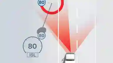 If the TSR detects a change in speed limit, it alerts the driver who can then apply a vehicle speed limiter to that speed by operating the resume button. AMT only.